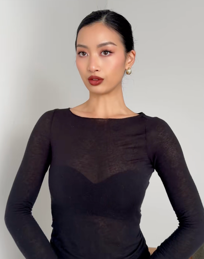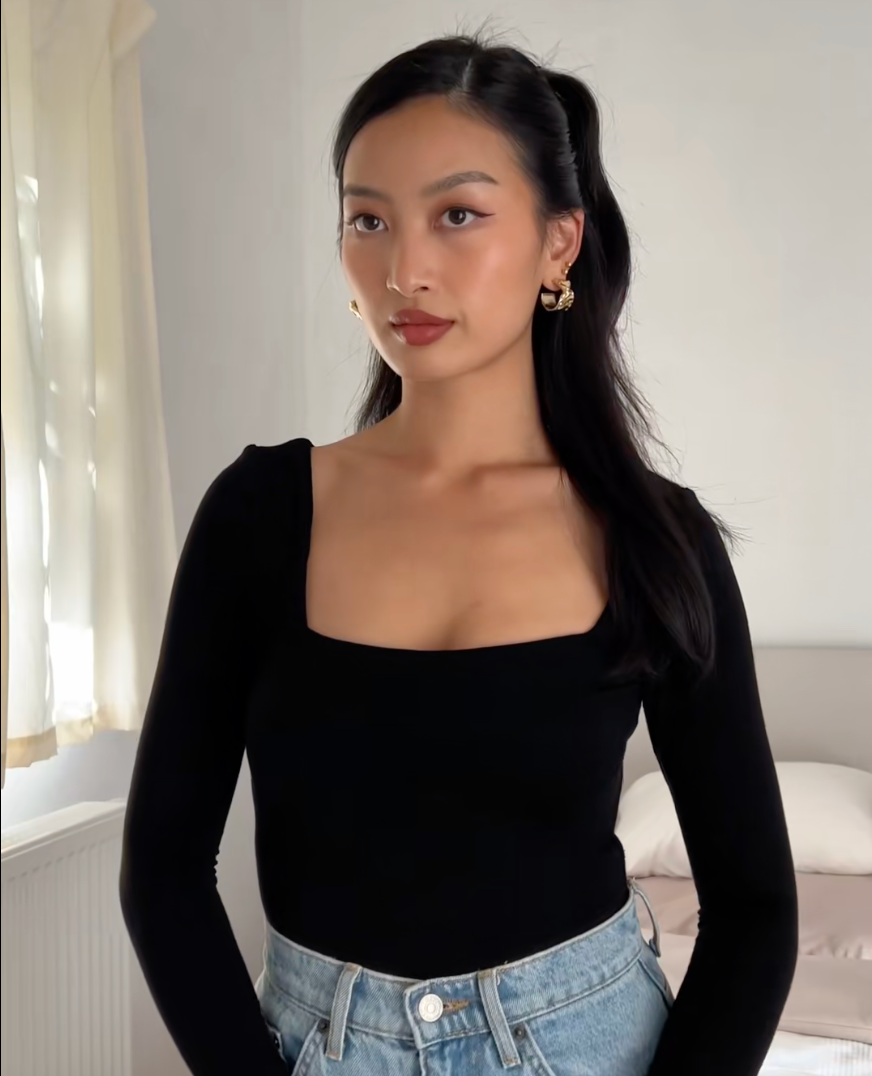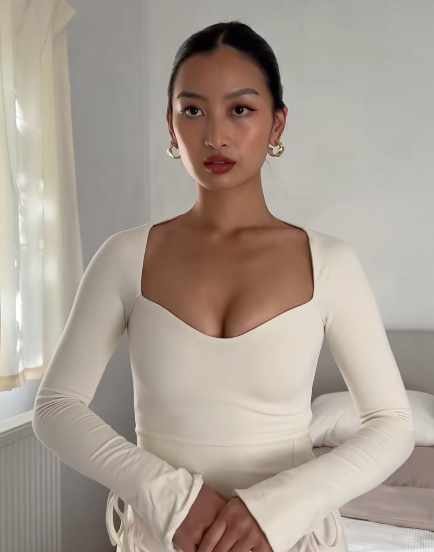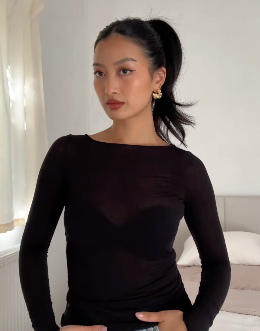 Body fit and length focus on how the top sits through the torso and where it ends. A semi fitted shape with light waist definition keeps balance without clinging. Fabric should skim the bust and fall smoothly through the midsection with stretch that holds shape. Length works best at mid hip, since cropped cuts draw focus to the midsection and long oversized lengths add bulk.